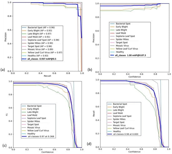 In our evaluation, we employed a comprehensive set of performance metrics, which allowed for a nuanced assessment of the model’s capabilities. By analyzing the precision–recall curve, precision versus confidence graph, F1-score, and recall versus confidence graph, we gained valuable insights into the model’s performance across various scenarios. This holistic approach is essential for developing reliable models for agricultural disease detection, where both accuracy and interpretability are critical for fostering user trust and facilitating informed decision making. Further analysis through confusion matrices provided detailed insights into each model’s performance, revealing their respective strengths and weaknesses. For instance, while both VGGNet and ViT exhibited high precision and recall rates, AlexNet displayed a tendency to overlook true positive cases despite its strong precision. In contrast, ResNet-50 significantly underperformed, highlighting the necessity for optimization and fine-tuning.
