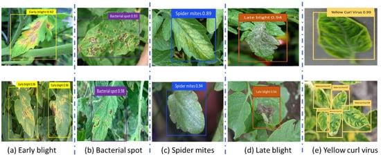 Detection of different tomato leaf diseases in complex images (a–f), including situations where leaves are at the image’s edge or partially obscured, and soil appearance.