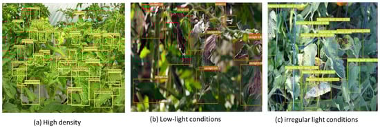 Detection of tomato leaf diseases in images showing (a) densely populated conditions, (b) low-light conditions, and (c) irregular light condition environments.