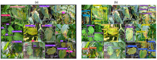 Comparison results of (a) a Yolo 9-based object detection model and (b) our method on a complex mosaiced image with different variants of diseases.