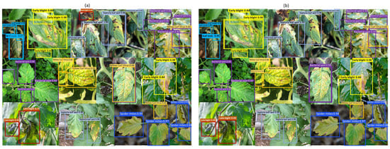 In contrast, Figure 10b displays the detection results from the modified ViT that incorporates CGA and the Focal CIoU loss function. This figure presents the same set of images processed by the enhanced model, showcasing more accurately placed bounding boxes and refined disease labels. Observations indicate that the bounding boxes are now more precisely fitted around individual leaves, significantly reducing overlap and improving the localization of disease symptoms. Misclassifications are markedly decreased; for example, the modified model accurately identifies both ‘Tomato Yellow Leaf Curl Virus’ and ‘Tomato Bacterial Spot’ with greater confidence. The model demonstrates a superior capacity to analyze complex scenes, effectively distinguishing between different diseases even in the presence of dense foliage. Additionally, visual heatmaps overlaid on the images (Figure 15) illustrate the areas where the model focuses its attention, highlighting a clear emphasis on regions exhibiting disease symptoms.