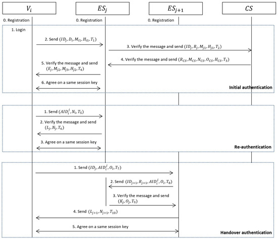 - ES: ESs communicate with vehicles in real-time and provide services. The transmitted data between an ES and a vehicle may contain sensitive and private data of the vehicle, and the transmission should be carried out after being mutually authenticated. In addition, when vehicles’ handover or re-authentication occurs, ESs should be able to verify vehicles quickly to ensure real-time communication.