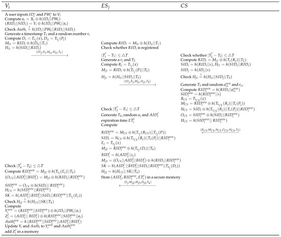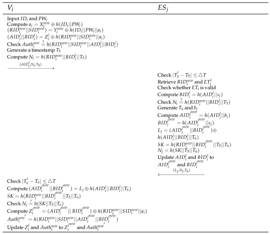 Within the expiration time determined in the initial authentication, can perform fast re-authentication with . When and are input to , computes , , and , and checks . If it is equal, generates a timestamp , computes , and sends to . checks whether ΔT, retrieves and using , and checks is valid. After that, computes and checks . If it is equal, generates a timestamp and a random number , computes , , , , and . sends to and updates and to and , respectively. checks whether ΔT, computes and , and checks . Then, computes and and updates and to and . Figure 4 presents the proposed re-authentication phase.