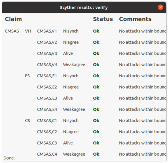 We simulated the CM-SAS using the Scyther tool [27], which is a developed for the automatic verification of security protocols. The Scyther tool verifies security for four statuses: Alive, Weakagree, Niagree, and Nisynch. The Alive status is the most basic level, which means that the communication partner is currently in a connectable state. Weakagree status is for checking whether the communication partner is legitimate. For example, the communication partner can decrypt or sign messages as well as being alive. Niagree is short for non-injective agreement. Niagree status means that the responder apparently previously ran the protocol with the sender, and both agreed on the values of the variables. Finally, Nisynch is short for non-injective synchronization, and it means that all the above conditions are satisfied and all messages are sent in the precise order described in the protocol. If a security protocol cannot satisfy the Nisynch status, it means that the protocol could be vulnerable to replay attacks. When a security protocol satisfies the four statuses, the protocol guarantees mutual authentication and resists replay attacks. The simulation result of the CM-SAS is shown in Figure 6. For all participating entities of the CM-SAS, the four statuses are satisfied, and we can say that the CM-SAS can guarantee mutual authentication and is resistant to replay attacks.