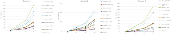 In the initial authentication, the CM-SAS has the lowest time cost on the vehicle side compared to the existing schemes, and has the second lowest time cost on the RSU/ES side. Compared to [11,12,14,15], TA/CS participates in the initial authentication and may have additional communication costs, yet it is much more efficient in terms of computational cost. In the handover authentication, the CM-SAS takes an overwhelmingly low computational cost on the vehicle, and on the RSU/ES side, it also takes significantly lower computational cost. Ref. [15] is the only scheme that considers re-authentication, and the CM-SAS is also much more efficient compared to the scheme of [15]. The computational cost of increasing the number of vehicles and RSU/ESs can be seen in Figure 7. In Figure 7, scenarios 1, 2, and 3 represent the initial, handover, and re-authentication situations, respectively. We assume that the existing schemes that do not design handover or re-authentication should repeat initial authentication in scenarios 2 and 3. Although the computational cost of the CM-SAS is similar to the scheme of [14] in the initial authentication, the CM-SAS is more efficient than other schemes. Furthermore, in the handover and re-authentication, the CM-SAS has a remarkably low computational load compared to any other schemes as the number of authentication increases. Overall, the proposed scheme is the most efficient compared to the existing schemes in terms of computational costs.