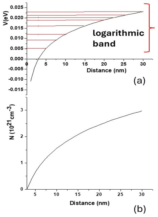 If (similar to galaxies) the flattened rotation curve regime sets in at large orbital distances, the energy scale β will be low enough for N−1/3 to satisfy the condition in Equation (2). An example of the logarithmic quantum refraction potential and the corresponding radial distribution of scatterer concentration in the case of helium atoms is presented in Figure 2. In this particular case, the parameter values of r0 = 3 nm and β = 0.01 eV have been assumed. This numerical example indicates that Equation (2)’s inequality may indeed to be satisfied with the reasonable choice of metamaterial design parameters. Thus, the only challenge to this approach is the engineering of controlled N(r), which is definitely possible in thin semiconductor samples. For example, it may be achieved by such well-developed techniques as spatially controlled ion implantation.