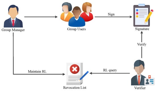 In multi-user signature systems, being able to revoke membership is crucial for blocking signatures from members who have misbehaved or voluntarily left the group. For large-scale groups, the VLR mechanism is considered to be more flexible. Figure 2 illustrates the specific flow. It involves maintaining a revocation list (RL) containing tokens for revoked users. The list is regularly updated and only provided to the verifier. According to the list RL, the verifier can test the signature’s legitimacy. If unsuccessful, the verifier rejects the signature.