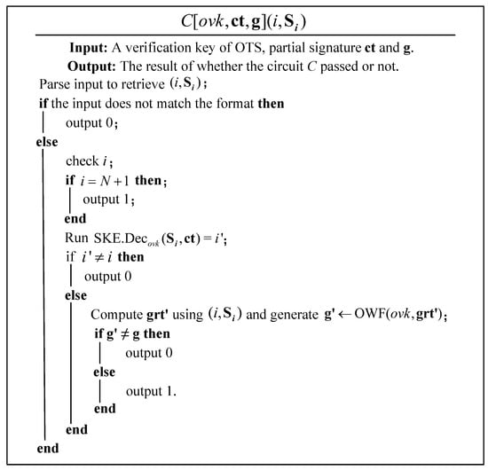 Here, we give a generic definition from an OTS in Section 2.3 with strong unforgeability, an OWF scheme with the underlying hard problem, and a secret key encryption scheme and indexed ABS scheme requested in [3]. We need this ABS scheme that can handle the function class , which serves to hardwire to and . See the circuit design in Figure 3.