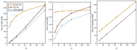 The three articles are based on the framework of [3] in Table 3. Ref. [20] proposes a lattice-based GS with forward security, which has a larger secret key size than the proposed one. Ref. [21] uses the Bonsai tree structure to propose a new GS scheme with a larger and . We construct this scheme shown in Section 4. The size of is similar to [21], and the other two are significantly smaller than [20,21]. In Figure 4, the performance of our scheme is more clearly represented by a line chart.