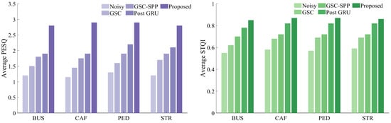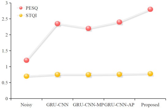 To verify the contributions of hybrid pooling and attentional weighting to the model’s effectiveness, this section discusses the feature selection fusion module in a categorized manner. This includes the convolutional self-coder (GRU-CNN) without the speech enhancement module, as well as models that incorporate simple speech enhancement modules: Maximum Pooling (GRU-CNN-MP) and Average Pooling (GRU-CNN-AP). Additionally, the model that integrates the Attention Mechanism feature selection fusion module is referred to as the Proposed model. Each model with different feature selection fusion modules was trained and tested, and Figure 5 presents the results of the objective evaluation metrics set for the various speech enhancement modules.