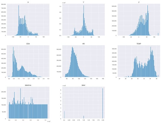 In this paper, a merged csv file dataset provided on Kaggle based on the study for continuous stress detection of nurses in a hospital during the COVID-19 outbreak was used for the training and testing of the best stress model classification [6,25]. The merged dataset was made up of approximately 11.5 million inputs across nine columns, which include accelerations in X, Y, and Z-axis, EDA, HR, the temperature of the skin (TEMP), id of the 15 users (id), extensive date and time inputs (datetime), and three levels of stress (label). The full database containing the signals, stress events, and survey responses was also made available on Dryad [26] for public release as the data has been properly anonymised. The structure of the dataset is presented in Table 2, while the distribution of each feature in the dataset is illustrated as in Figure 2.