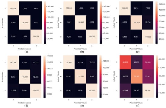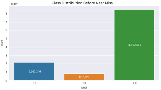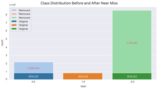 In this particular study, NearMiss-1 undersampling technique was applied to the original dataset and the post-resampling class distribution is visualized in Figure 4. In this process, NearMiss-1 picked samples from Class 0 and Class 2 (majority classes) with the smallest mean distance to the 10 nearest neighbors of Class 1 (minority class) samples. As a result, around 62.7% of samples from Class 0 and 90.6% of samples from Class 2 were removed. The three classes were equally distributed totaling up to 2,418,666 entries for the dataset training.