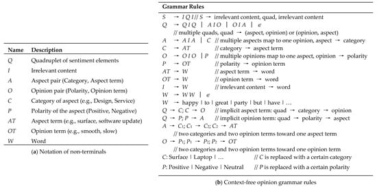 - Cai, H.; Xia, R.; Yu, J. Aspect-Category-Opinion-Sentiment Quadruple Extraction with Implicit Aspects and Opinions. In Proceedings of the 59th Annual Meeting of the Association for Computational Linguistics and the 11th International Joint Conference on Natural Language Processing (Volume 1: Long Papers), Online, 1–6 August 2021; pp. 340–350. [Google Scholar] [CrossRef]