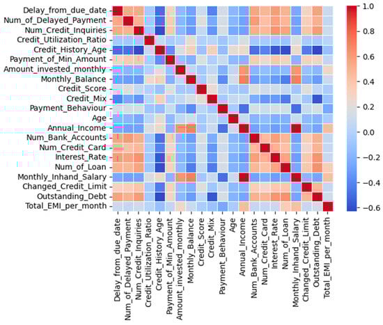 According to the correlation matrix in Figure 4, features such as “Delay_from_due_date” and “Num_of_Delayed_Payment” appear to be positively correlated, suggesting that individuals with more delayed payments also have a longer delay in making payments; “Credit_Utilization_Ratio” and “Monthly_Balance” show a negative correlation, meaning that as credit utilization increases, monthly balance tends to decrease. “Outstanding_Debt” and “Total_EMI_per_month” exhibit a positive correlation, indicating that higher outstanding debt is associated with higher monthly EMI payments. Table 2 describes the data features and a short description of each feature. There are 20 features as a dependent variable that contain continuous values, and one independent variable labeled “Credit_score” that contains three categorical values.