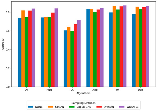 To answer RQ2, “How effective are GAN-based oversampling methods on credit score classification performance?”. As visualized in Figure 5, the GAN method applied to each machine learning algorithm was improving accuracy. However, CTGAN and CopulaGAN did not significantly improve the accuracy performance, while DraGAN and WGAN-GP consistently performed well across all algorithms, frequently achieving the highest or near-highest accuracy scores. This indicates that WGAN-GP is effective in generating realistic synthetic data that enhances machine learning performance.