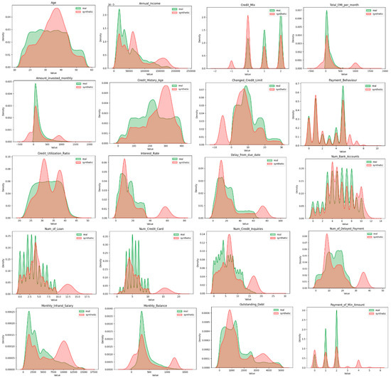 Figure 6 illustrates how closely the synthetic data generated by WGAN-GP matches the real data in terms of feature distributions. In the plots, the density curves of real data (in green) and synthetic data (in red) are overlaid for each variable. Although WGAN-GP shows effectiveness in replicating the general patterns of many features, there are still discrepancies for certain variables, particularly where the real data distributions have more complexity or irregularity.
