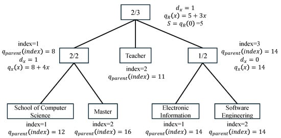 The tree structure is one of the representations of . In the access tree , each interior node records the count of its child nodes and specifies the minimum number of child nodes whose attributes must be satisfied to fulfill the access policy. Parameter denotes the quantity of child nodes and represents the threshold, with the condition that . Every terminal node of the access tree corresponds to an attribute, and its threshold is set to 1.