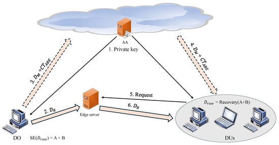 Considering the semi-trusted nature of sharing platforms and the potential for key leakage, it is right to reduce the reliance on the security of shared platforms and user keys. The goal of our research is to secure the shared data in the context of semi-trusted sharing platforms and key leakage, which ensures that data sharing proceeds securely and that the data are shared with the target users. Segmented data storage in the cloud is one solution [14,15]. However, in distributed cloud storage [16], data are still subject to an unknown storage environment. Qiu [14] addressed the issues of insecure cloud data and key leakage by utilizing secure mobile devices for storing partial data residuals. This approach, while effective, is not suitable for scenarios involving large volumes of data owing to the constrained storage capabilities of mobile devices. On the other hand, Wang [15] mitigated the dependence on user private keys by leveraging edge servers and local device storage. However, this strategy is inapplicable for contexts of data sharing between the specified group of users.