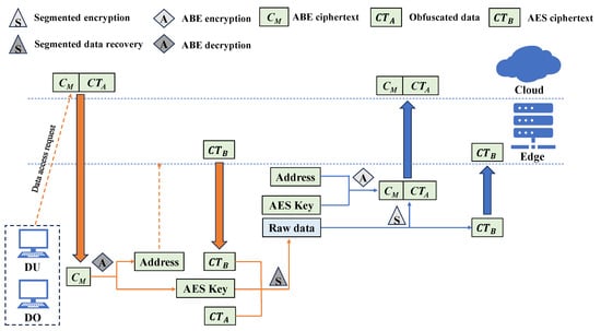 Let D be the raw shared data, F denotes the process of data segmentation, R be the data merging and recovery process, is the metadata, and is the corresponding ciphertext. is the residuals data, and is the corresponding ciphertext. E be the encryption algorithm, be the decryption algorithm, K be the symmetric encryption key of the metadata, be the cloud platform address, be the edge server address, KeyGen be the ABE key generation algorithm, be the user attribute set, be the access attribute characteristics. be the CP-ABE ciphertext. “↗” denotes data upload, and “↘” denotes data download. The formal model of data sharing is as follows.