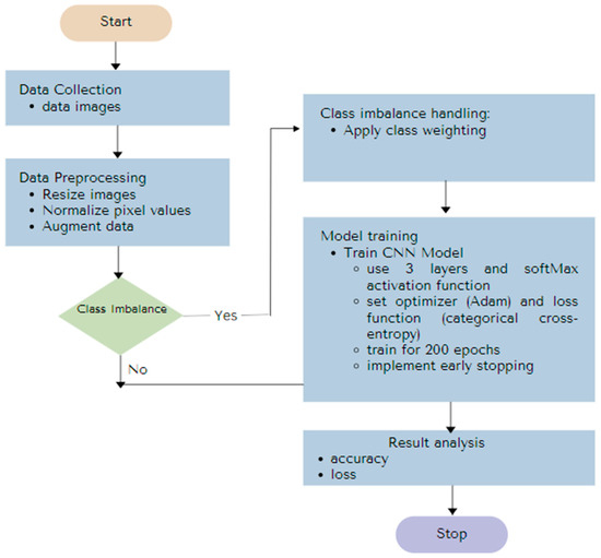 - Architecture Selection: A CNN architecture (such as ResNet, VGG, or a custom CNN) is selected. The selected architecture should be able to learn unique features from a dataset and effectively extract features from the dataset. Properly selecting architectures, output layer structures, and loss functions is critical for multiclass classification. This configuration facilitates the model’s ability to detect differences between classes efficiently.