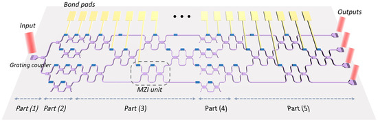 The schematic of the photonic computing chip demonstrated in this work is shown in Figure 1. The chip consists of five parts. Part (1) is a 1-to-4 power splitter, and Part (2) is composed of four parallel MZIs, which connect to the respective outputs of the power splitter. These MZIs are used to load the input signals by modulating the light intensity. Parts (3), (4), and (5) are all MZI arrays, which can perform an arbitrary matrix transformation as a whole according to singular value decomposition [31]. Specifically, Parts (3) and (5) are the same and are composed of six MZIs, respectively, which are arranged as a rectangular mesh, as reported in Ref. [29]. These two parts can perform arbitrary unitary matrix transformation. Part (4) has 4 MZIs used for intensity attenuation, achieving arbitrary diagonal matrix transformation. The rectangular scheme, rather than the triangular scheme [32] designed by Reck, is chosen in order to halve the optical depth, which is important for minimizing transmission loss and reducing chip size. Besides, the rectangular scheme has a natural symmetry that makes it significantly more robust to fabrication errors [31]. In general, the chip contains 20 MZIs and 40 phase shifters in total.