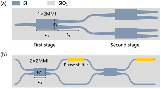(a) Schematics of the 1-to-4 power splitter. There is one MMI in the first stage and two in the second. (b) Schematic of an MZI unit.