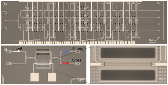 The photonic computing chip has been crafted on the silicon-on-insulator (SOI) platform, featuring a top Si layer of 220 nm and SiO2 cladding of 2 μm. The grating coupler employed is of the focused type [31], with a shallow etch depth of 150 nm. The grating’s period and duty cycle are designed at 650 nm and 0.5, respectively, optimized for a center wavelength of 1550 nm. The power splitter in Part (1) is comprised of three cascaded 1 × 2 multimode interference (MMI) couplers, with detailed structures depicted in Figure 2a. The first MMI stage divides the incident light into two equal parts, and, subsequently, the second MMI stage further divides this light into four equal components. The dimensions of the multimode waveguide are specified as L1 = 7.9 μm in length and W1 = 3.2 μm in width. To mitigate abrupt width transitions and minimize reflection losses at the junctions between single-mode and multimode waveguides, tapered structures with a length of Lt = 10 μm are introduced. We employ a light source with a wavelength of 1550 nm and a power of 10.6 dBm as the input for the beam splitter, resulting in optical powers of approximately 4.3 dBm, 4.2 dBm, 4.2 dBm, and 4.2 dBm at its four output terminals, respectively. Consequently, the beam splitter exhibits an excess loss of approximately 0.4 dB.