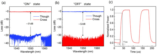 Prior to testing the entire device, the modulation efficiency and speed of the MZI unit are initially characterized. Figure 4a,b depicts the measured transmission spectrum of the MZI unit functioning as an optical switch. Regardless of whether the MZI switch is in the “ON” or “OFF” state, its excess loss, a metric representing the dB loss of the total optical power at all output ports compared to the input optical power, remains under 1 dB. Additionally, at the operating wavelength of 1550 nm, the extinction ratio of the MZI switch surpasses 30 dB, demonstrating excellent performance. Note that 18 mW electrical power is needed to change the MZI state between “ON” and “OFF”. Figure 4c illustrates the optical response of the MZI unit when driven by a 10 kHz square wave electrical signal. The ascending phase of the optical response, which encompasses a transition from 10% to 90% of its normalized maximum, endures approximately 11μs. This indicates that the modulation speed of the MZI reaches approximately 90 kHz.