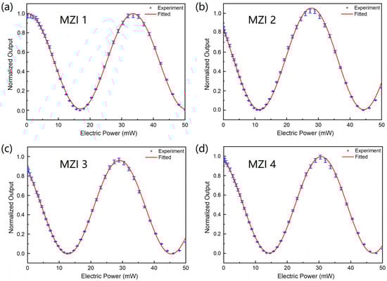 As previously stated, the MZIs in Part (2) function as intensity modulators and require pre-calibration to establish a relationship model between optical output and electrical input. Figure 5 illustrates the normalized optical output power (i = 1, 2, 3, 4) plotted against the electric power applied to the () in Part (2). This relationship can be theoretically described by the equation provided below, with and representing the electric power corresponding to the minimal and maximal optical output, respectively: