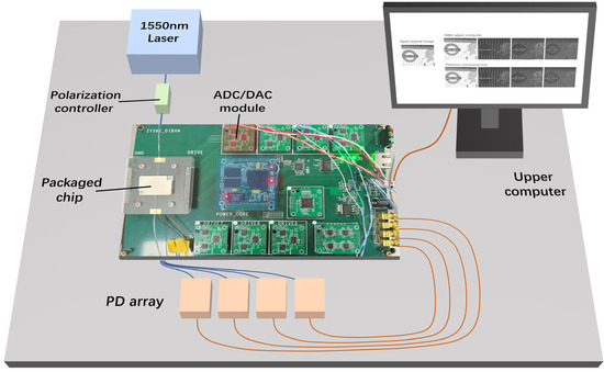 The light source of the system is a laser (SFL1550P, Thorlabs, Newton, NJ, USA) emitting at 1550 nm with an output power of 10.6 dBm. To enhance the coupling efficiency between the light source and the chip, a polarization controller (CPC900, Thorlabs, Newton, NJ, USA) is utilized. The MZI network is pre-configured to perform matrix multiplication with the control circuit by tuning the output voltage of the DACs. After transmission, the outputs of the chip are obtained by four photodetectors (DXM20AF, Thorlabs, Newton, NJ, USA), converted to four photocurrents, and then acquired by the ADCs.