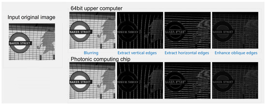 The image convolution results of the 64-bit upper computer and photonic computing chip. The operations in the figure, from left to right, are blurring, extracting vertical edges, extracting horizontal edges, and enhancing oblique edges.