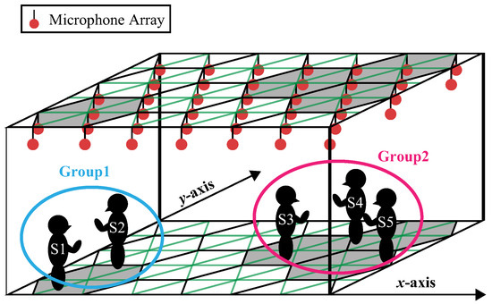 We describe a method for simultaneously detecting multiple acoustic events scattered within a space from the observed signals by distributing multiple microphone arrays and estimating their source positions. Microphone array technology is a technology that groups multiple microphone elements and uses them as one virtual microphone. This is a method that allows you to control the directivity of a virtual microphone using software control. The observation space targeted by our method is a wide area that is several tens of meters or more in each axis. Our method is an elemental technology for a system that analyzes and visualizes dialogue activities by distributing multiple microphone arrays on the ceiling of a large hall. The reason for installing the microphone array on the ceiling is to prevent it from affecting the propagation of sounds emitted during dialogue activities. Many such systems have been proposed in the last few decades [5,6,7,8], but the problem is that they do not cover a sufficient area. Figure 1 shows the microphone array arrangement in the system. The orange circle marks in the figure represent the microphone array. The microphone array is arranged in a triangular repeating structure on the ceiling. We propose a solution to the problem of detecting the presence or absence of people’s speech and estimating the location of speech from multichannel audio signals observed with these microphone arrays. If this problem can be solved, it will be possible to estimate which conversation group a speaker belongs to based on the proximity of the speaker’s utterance position.