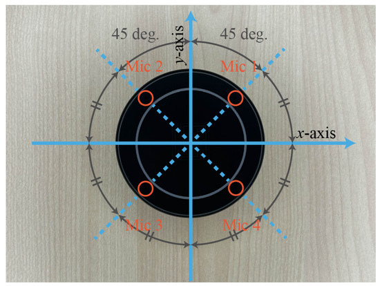 In this work, we use a 4-channel circular microphone array with a diameter of 65 mm, as shown in Figure 2. Microphone elements are mounted at the positions indicated by the four orange circles in Figure 2. The four elements are arranged at equal angular intervals on the same circumference.