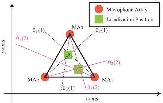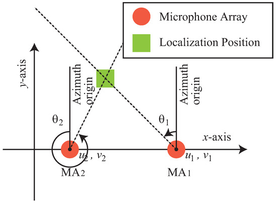 Two microphone arrays are required to localize the sound source based on the principle of triangulation. We represent the coordinates of the two 4-channel microphone arrays, and as and . In addition, we show the sound source directions estimated by these microphone arrays are and . Figure 3 shows an overview of the localization of one sound source by triangulation with and . The two orange circle marks show microphone arrays and the yellow green rectangle mark shows the localization position of a sound source. The yellow green rectangle mark is placed at the intersection of dotted lines from two microphone arrays. These two lines show the sound source direction estimated by the microphone array. The origin of the azimuth, which represents the sound source direction, is the positive direction of the y-axis in Figure 3. Also, the positive direction of the angle is counterclockwise.
