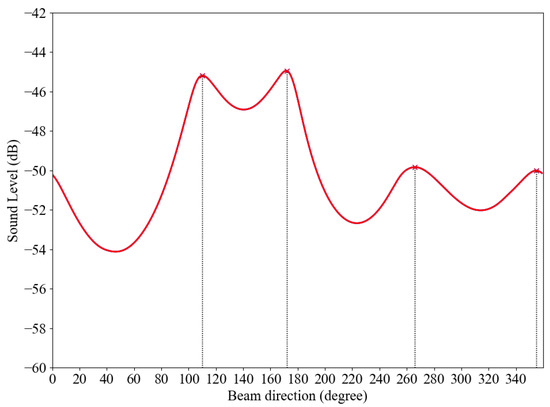 Algorithms such as generalized cross-correlation with phase transform (GCC-PHAT) [10], multiple signal classification (MUSIC) [11], and steered response power (SRP) [12] can be used for sound source direction estimation. Some methods, such as GCC-PHAT, cannot estimate multiple sound sources simultaneously. MUSIC and SRP can simultaneously estimate the directions of multiple sound sources. However, compared to SRP, MUSIC is unsuitable for our objective, which uses a large number of microphone arrays, because it consumes a large amount of computational resources. SRP collects sound by beamforming in several predetermined directions, and estimates the direction of the sound source based on the relationship between the direction and the collected sound energy. This method uses the direction of the local maximum value in the directional distribution of energy as the direction of the sound source. In the case of multiple sound sources, multiple local maxima appear. Figure 4 shows an example of four local maxima appearing when two sound sources are observed by SRP based on the minimum variance distortionless response (MVDR) [18,19]. The horizontal axis shows the direction of beamforming. The vertical axis shows the output sound level of beamforming. A high output level can be obtained if the direction of the beamforming is close to the direction of the sound source. The steering step is 1 degree. Two sound sources are placed at 110 degrees and 172 degrees. Two local maxima appear at the directions corresponding to the true sound sources but the other two local maxima appear at 266 degrees and 355 degrees. Since the local maximum value of the true sound source often has a higher value, it is compatible with threshold processing to remove extra local maximum values. In this way, the direction of the sound source corresponds to the local maximum level obtained by scanning the observation space using beamforming.