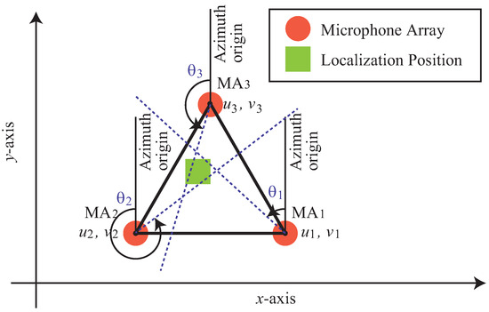 We explain the details of the conventional method for one sound source. The three 4-channel microphone arrays (, ) are placed at the vertices of an equilateral triangle area. In addition, we represent the sound source direction estimated by the mth microphone array as . Figure 5 shows an overview of localization of one sound source by triangulation with , , and . The orange circle marks show microphone arrays and the yellow green rectangle mark shows the localization position of a sound source. The yellow green rectangle mark is placed at the center of gravity of the triangle formed by the intersections of the three dotted lines corresponding to the sound source directions estimated by the three microphone arrays. The origin of the azimuth, which represents the sound source direction, is the positive direction of the y-axis in Figure 5. Also, the positive direction of the angle is counterclockwise.