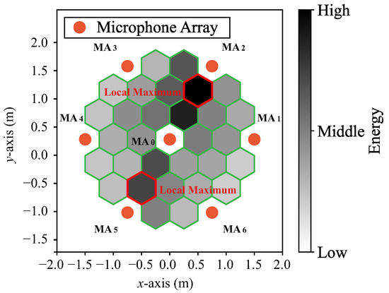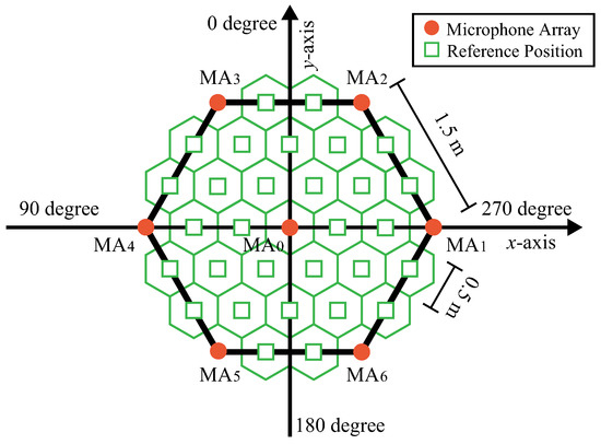 Figure 7 shows the arrangement of the microphone array and the position where the energy is estimated to assess the spatial energy distribution. Since it is not possible to estimate the energy distribution in a continuous space, the positions at which the energy is estimated are discretized into 37 positions. The energy distribution in this space is represented using 30 positions, excluding the 7 positions where the microphone array is placed. We call these 30 positions reference positions (). The orange circle marks show microphone arrays, and the green square marks show reference positions. A regular hexagon is made by connecting the . The inside of this regular hexagon is the observation space.