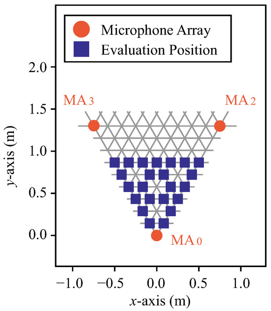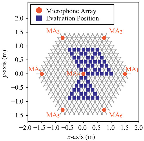Figure 13 shows the arrangement of the microphone array and the position of the evaluation sound source. The orange circle marks show the microphone arrays and the blue rectangle marks (63 positions) show the sound source positions for evaluation. These positions are called evaluation positions. The evaluation position is on the trisection point between the reference position and the adjacent reference position, and the reference position itself is also an evaluation position. The sound source signals for evaluation at these positions were created from the measured impulse responses as in Section 6.1.