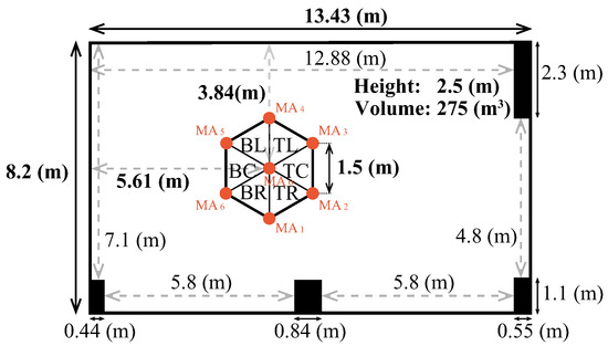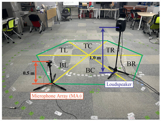 The impulse response was measured at Osaka Sangyo University, Building 15, Laboratory 806 (Room number 15806). Figure 11 shows the regular hexagonal area containing the measurement positions in the room superimposed on the bird’s eye view of 15806. The background noise level in room 15806 was approximately , and the reverberation time was approximately . The output level of the speech signal for evaluation was adjusted to be equivalent to to 70 dB, which is the average Japanese conversation level.