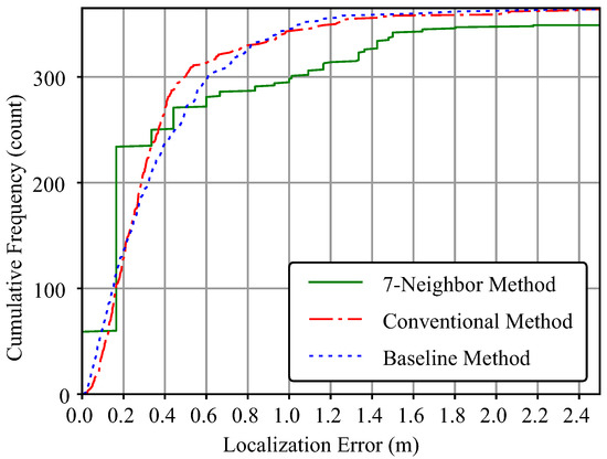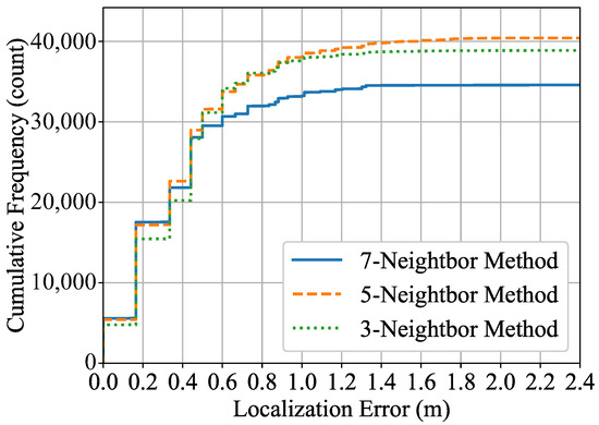 Figure 14 shows the results of the p-Neighbor method for . We can see how the cumulative distribution of localization errors changes depending on the number of microphone arrays used to estimate spatial energy. When the acceptable error is less than 0.5 m, the number of detected acoustic events tends to increase as p increases from 3 to 7. In contrast, it can be seen that is suitable over 0.5 m, especially over 1.0 m. It can also be seen that the number of detections of saturates rapidly over 0.5 m.