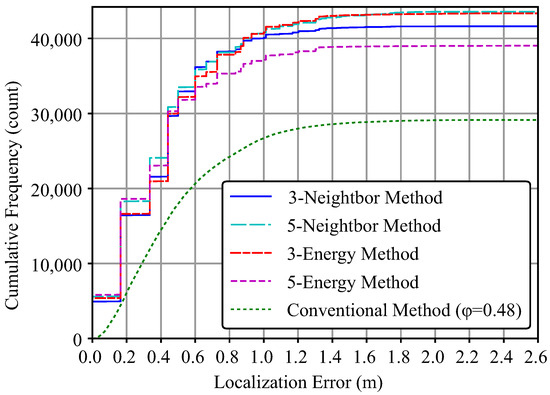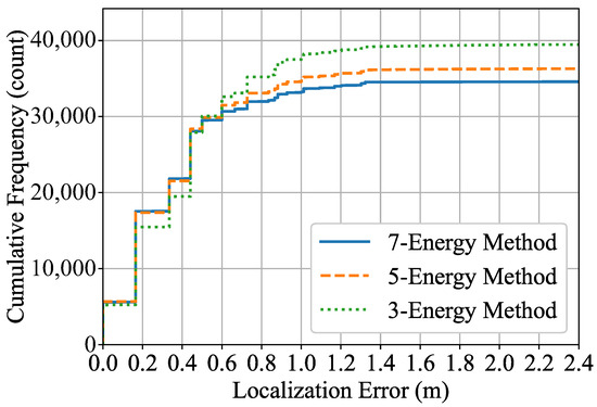 Figure 15 shows the results of the p-Energy method for . We can see how the cumulative distribution of the localization errors changes depending on the number of microphone arrays used to estimate the spatial energy. When the acceptable error is less than 0.5 m, the number of detected acoustic events tends to increase as p increases from 3 to 7. In contrast, it can be seen that is suitable over 0.5 m, especially over 1.0 m. It can also be seen that the number of detections of saturates rapidly over 0.5 m.