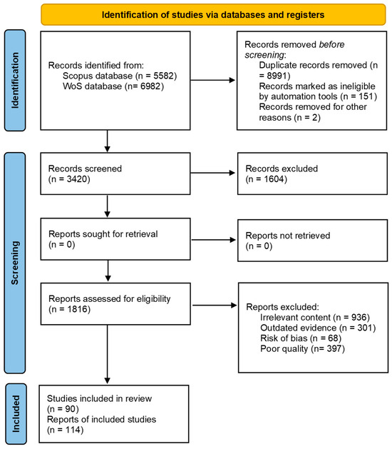 The process of review selection, using the PRISMA 2020 flow diagram template, is presented in Figure 3; also, this study was conducted in accordance with the PRISMA 2020 guidelines (see Supplementary Materials).