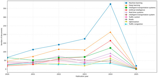 Simultaneously, the application identifies topics related to published articles focusing on traffic systems. By utilizing ScientoPy and the author’s subjects (derived from all their keywords), a timeline was generated, as illustrated in Figure 4.
