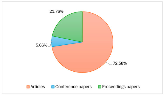 Figure 6 presents a pie chart with the percentage distribution of the identified papers by their type (conference, journal, or proceedings). Journal articles constitute 71.72% of the total number of papers considered after the screening step.