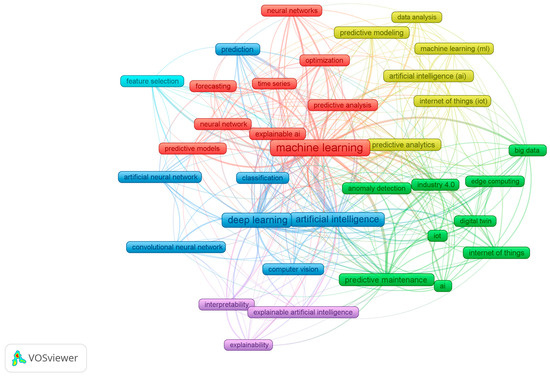 In Figure 7, the network visualization of the keyword co-occurrence is presented, constructed using VOSviewer software v.1.6.20 [17]. The author-provided keywords that appear more than 15 times are 64. The top three keywords are: “machine learning” (occurrences: 754 and total link strength: 756), “deep learning” (occurrences: 347 and total link strength: 424), and “artificial intelligence” (occurrences: 306 and total link strength: 406).