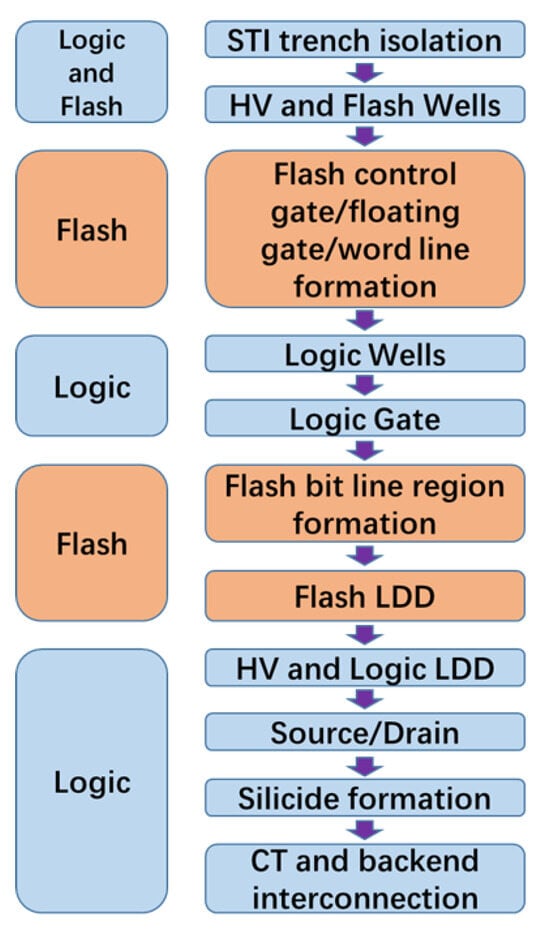 The NORD Flash cell used in this research, whose intellectual property rights belong to Shanghai Huahong Grace Semiconductor Manufacturing Corporation, Shanghai, China, is depicted in Figure 2b. Compared to an ESF3 cell, the NORD Flash cell has only one self-aligned select gate, which significantly reduces the number of photo layers and is beneficial in the further scaling of the Flash memory cell.