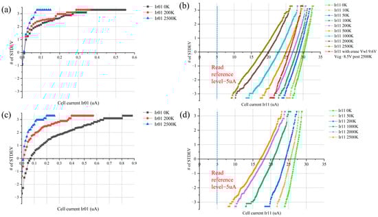 Cell current Ir01 and Ir11 distributions at different P/E cycle times ranging from 0 K to 2500 K. (a,b) Each operation was at RT = 25 °C. (c,d) Each operation was at 85 °C. The dashed vertical lines represent the current of the read reference level—5 μA.