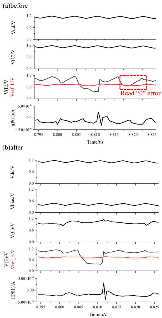 It turns out that when the supply voltage is unstable, the read “0” error will be more likely to appear, as the simulation result shows in Figure 8a with Vdd fluctuating within 1.05–1.2 V and the fluctuate frequency is 125 MHz. The E point fluctuates along with the power supply, which will cause it to cross over the Vref_E and the output incorrect signals during read ”0”. Figure 8b illustrates that after introducing the common-mode coupling mechanism, data misreading caused by supply voltage fluctuation can be solved.