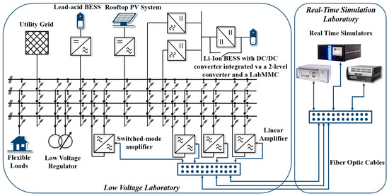 The Low-Voltage Microgrid Laboratory (LV-Lab) is interfaced to the hybrid HVDC/MVDC test bench, which is implemented on digital real-time simulators within the Real-Time Simulation Laboratory. The LV-Lab integrates real power equipment, such as battery storages, renewable energies, and loads, in combination with power amplifiers for PHiL simulation to achieve a flexible and realistic testbed for the investigation of sustainable energy supply. A scheme of both connected laboratories is depicted in Figure 5. Xilinx’s aurora protocol-based communication via fiber-optical cables connects the RTDS NovaCor Simulator of the Real-Time Simulation Laboratory with power amplifiers within the Microgrid-Lab.