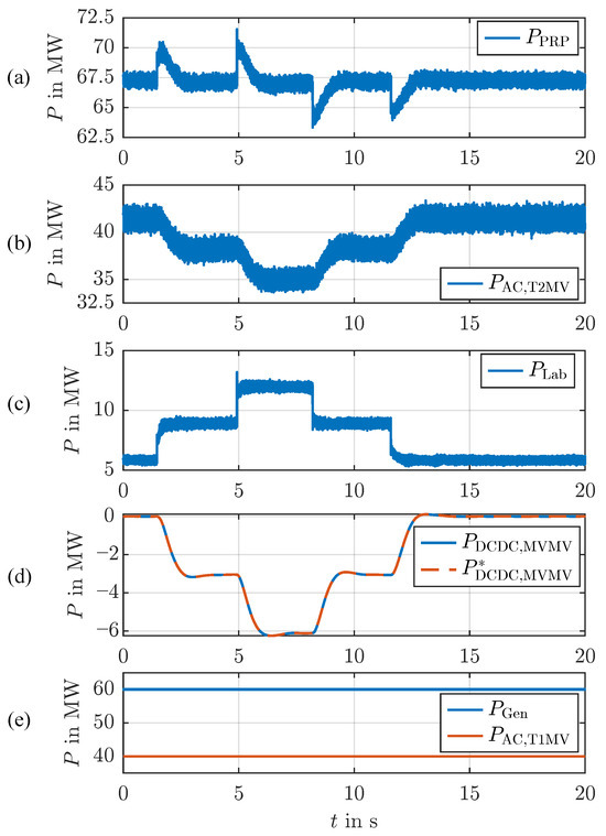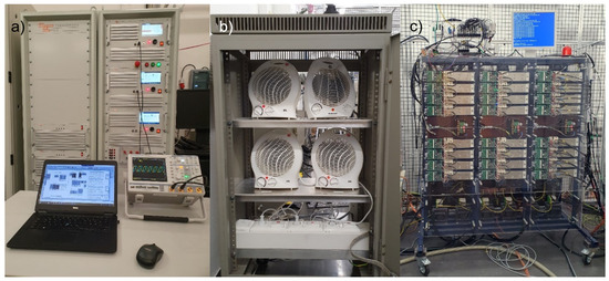 A NovaCor Chassis from RTDS is utilized for the test bench. Three fiber-optical cables connect the real-time simulator and a linear power amplifier (LPA). For the tests, a Spitzenberger&Spies amplifier with one APS5000 system per phase is used (represented by one linear amplifier in Figure 5). This allows for a four-quadrant-rated power provision or consumption up to per phase. The tests are performed with the amplifier in voltage control mode with current limits. An enhanced ideal transformer method [55] acts as the interface between the HV simulation and the LV-Lab. The scaling factor for the feedback current and thus the power of the connected hardware is set to 1000 to match the dimensioning of the simulated components. The real-time simulator sends voltage signals at a selected connection point and transfers the signals to the power amplifier. The power amplifier sets an output voltage, which leads to a current flow with connected hardware. The current is measured within the power amplifier and transferred back to the real-time simulator by means of a current injection at the interconnection point. Different static and dynamic power hardware of the Microgrid-Lab is interfaced with the HVDC/MVDC test bench. These include a purely resistive three-phase heating load with a total loading of up to 7 kW and a lithium-ion battery. The storage system is integrated parallel via a 2-level converter and a laboratory-scale modular multilevel converter (LabMMC) (see Figure 5), in which various GFL and GFM control schemes are implemented. These include setpoint operation, various droop controls, and virtual inertia provision [56]. In the context of this paper, only the LabMMC is considered, since 2-level converters inherently induce more non-idealities, which subsequently are also scaled with the used interfacing method [55] and thus would produce unrealistic load behavior in high-voltage applications, which is the primary goal of this integration. The LabMMC has four half-bridge submodules per converter arm. The rated apparent power of the LabMMC is [57]. This work considers the LabMMC in setpoint operation as a variable GFL load. The described lab setup is depicted in Figure 6, including the LPA (a), the resistive load (b), and the LabMMC (c).